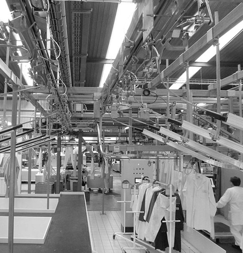 - En aval du lavage : un convoyeur à vêtement emmène le linge mouillé vers un tunnel de séchage, puis le linge est trié automatiquement grâce au code barre ou puces RFID. Les vêtements sont ensuite acheminés vers des postes de houssage, filmage, pliage. Nos systèmes permettent également de gérer la mise en attente dans les espaces de stockage, ainsi que l’acheminement retour jusqu’au camion de livraison à quai.